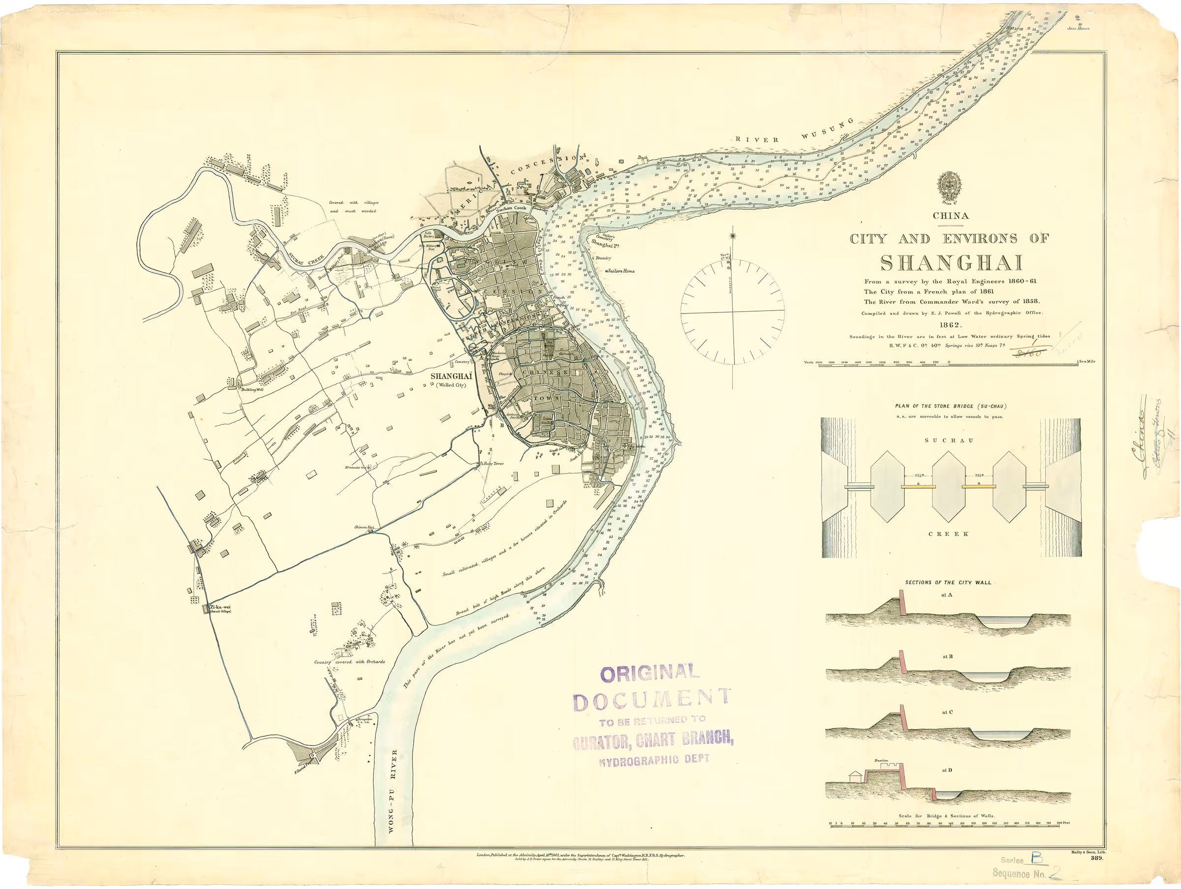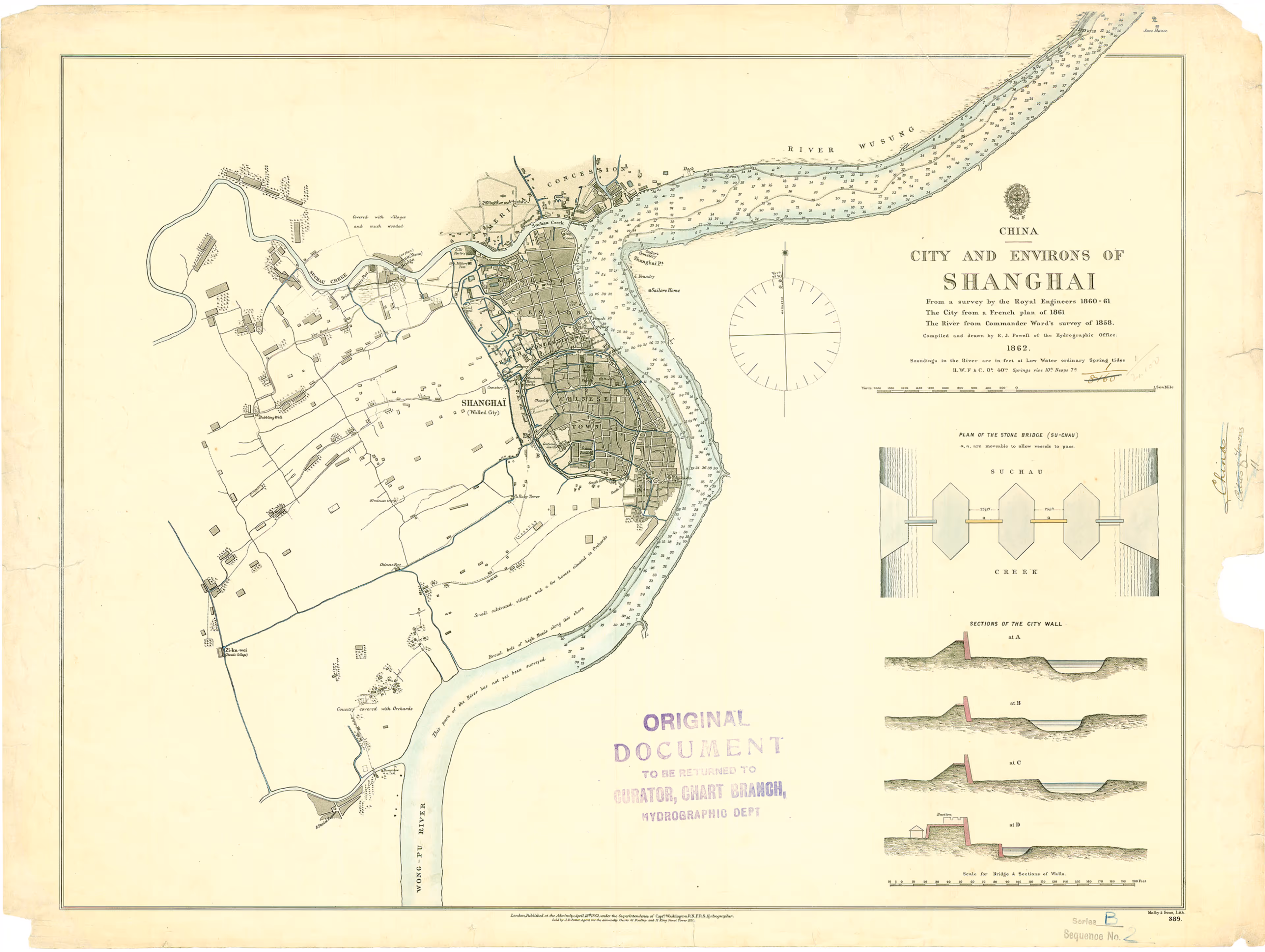 Painted map of the walled city, with the names of bridges, gates, and main buildings in Chinese. The dating by the RGS is open to question. As a document, it may have been produced in 1870, but the map presents a view of Shanghai that predates 1870. In particular, one can see the Temple of Tianhou, that was destroyed in 1860 when the French bombed the insurgents in the neighboring walled city. North China Herald, 25th August 1860, p.134: 'The insurgents had however worked their war round almost to the French quarter, and had planted some flags on the temple of the Queen of Heaven. Our gallant allies set to work, in a manner peculiar to themselves, to drive away the danger, and to prevent its recurrence fired the suburb, which is by far the richest and most important collection of native houses. ... the flames sprang up with fearful grandeur. The name "shangyang" (上洋) is an old designation for Shanghai, one that fell into oblivion after the 19th century (see General description of Shanghae and its environs, extracted from native authorities, 1850, p. 21)