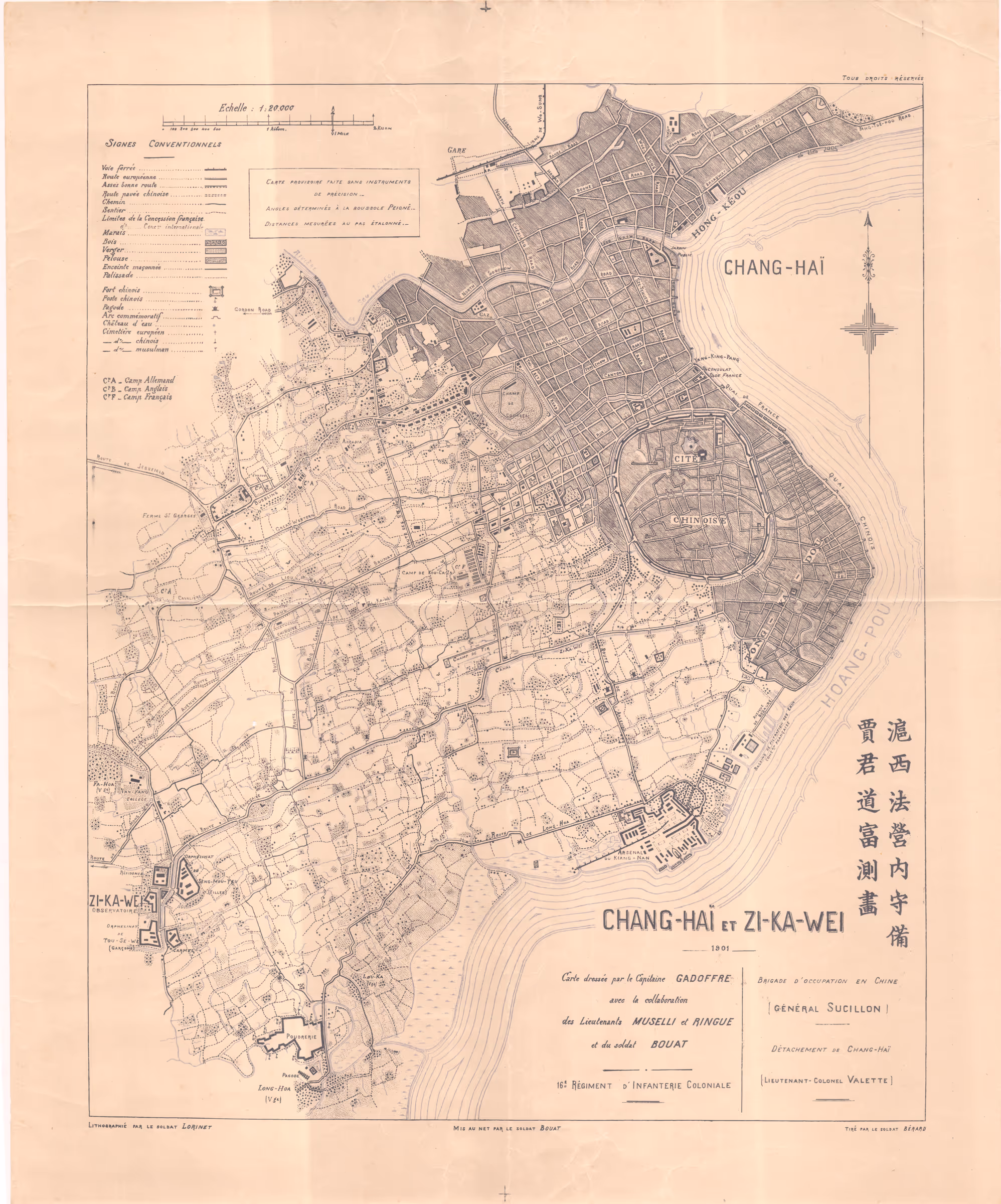 Compiled and arranged from the following maps [see list] for the Intelligence Branch, China Expeditionary Force. 1. Map of Whampoo by A.M. Bisbee 2. Map of the Foreign settlements, Shanghai 3. Shanghai Spoting Mao. Between the Soochow & Sicaway Creeks by C.Cornius 4. Maps of Creeks between the Woodlands & Hongkew Creeks 5. Captain Tweddle's survey of Ditches east of Hongkew Creek 6. Survey between the French Sicaway and the River by S. Bryant Rowe 7. Chinese map of the city and suburbs 8. Sketch map of the camps near Arsenal 9. Sketch map of Pootung 10. Plann shewing houses west of Defense Creek 11. Plan of Shanghai from Intelligence Branch Also available on Earthworks at Stanford University