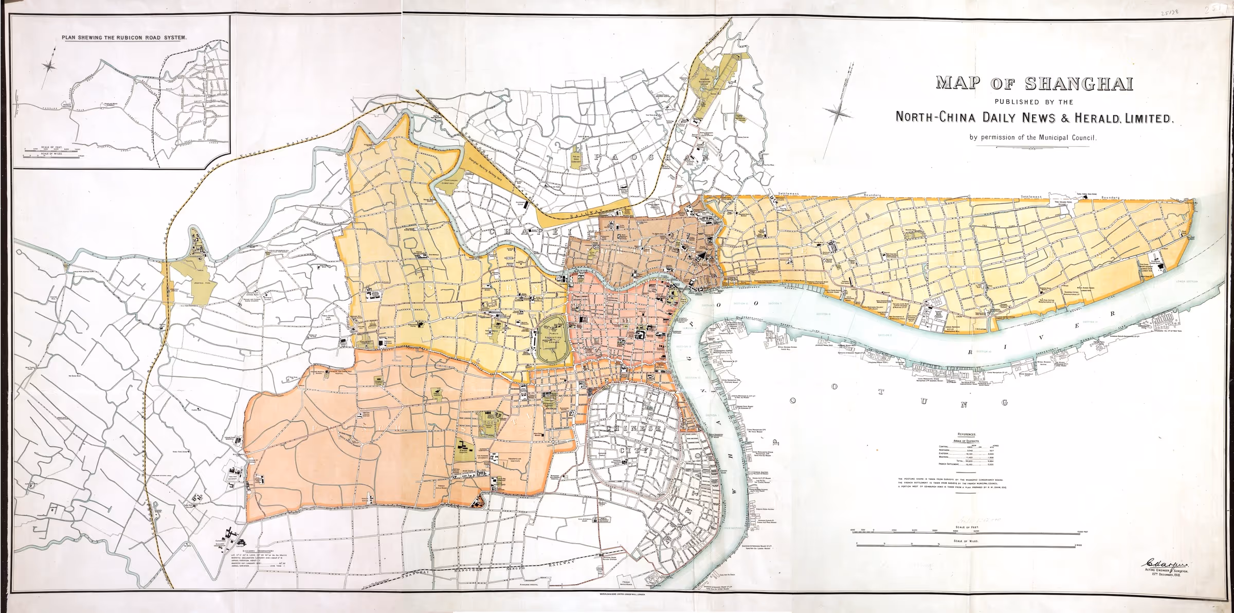 This untitled map accompanied the set of three maps (ID 1873, ID1874, ID1875) showing the land properties owned by foreigners in Zhabei, the northern and western External Roads Areas in 1914. Map prepared for the negotiations held between the British and Chinese government with a view to obtain a further extension of the International Settlement. The Chinese government refused to grant the extension.